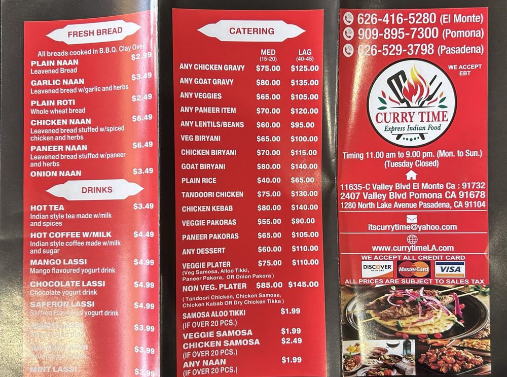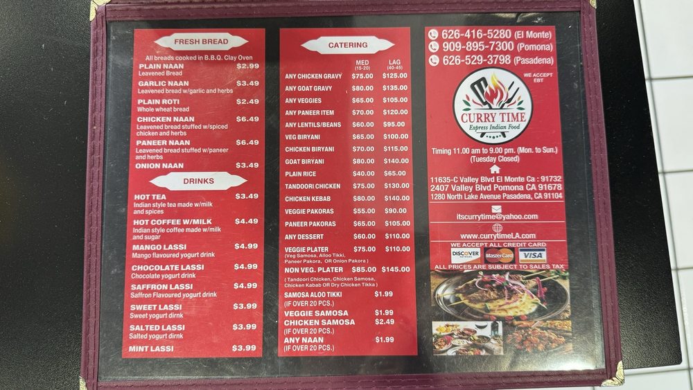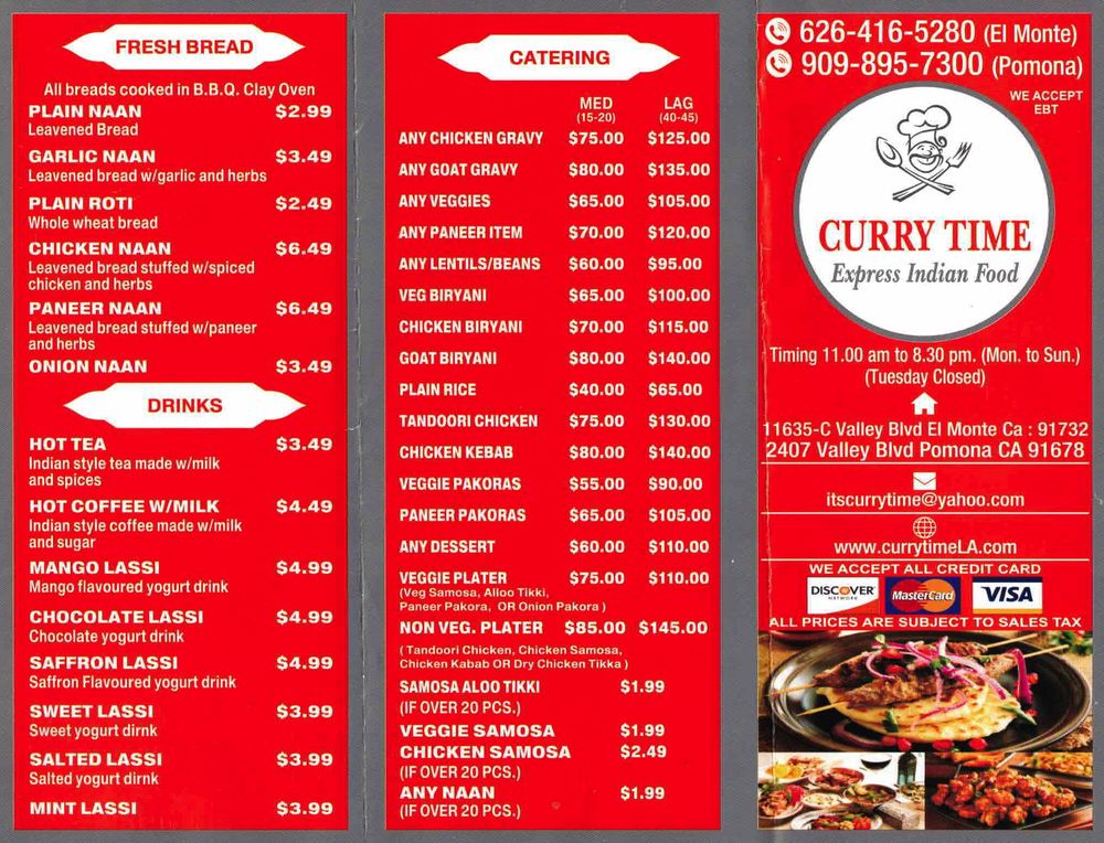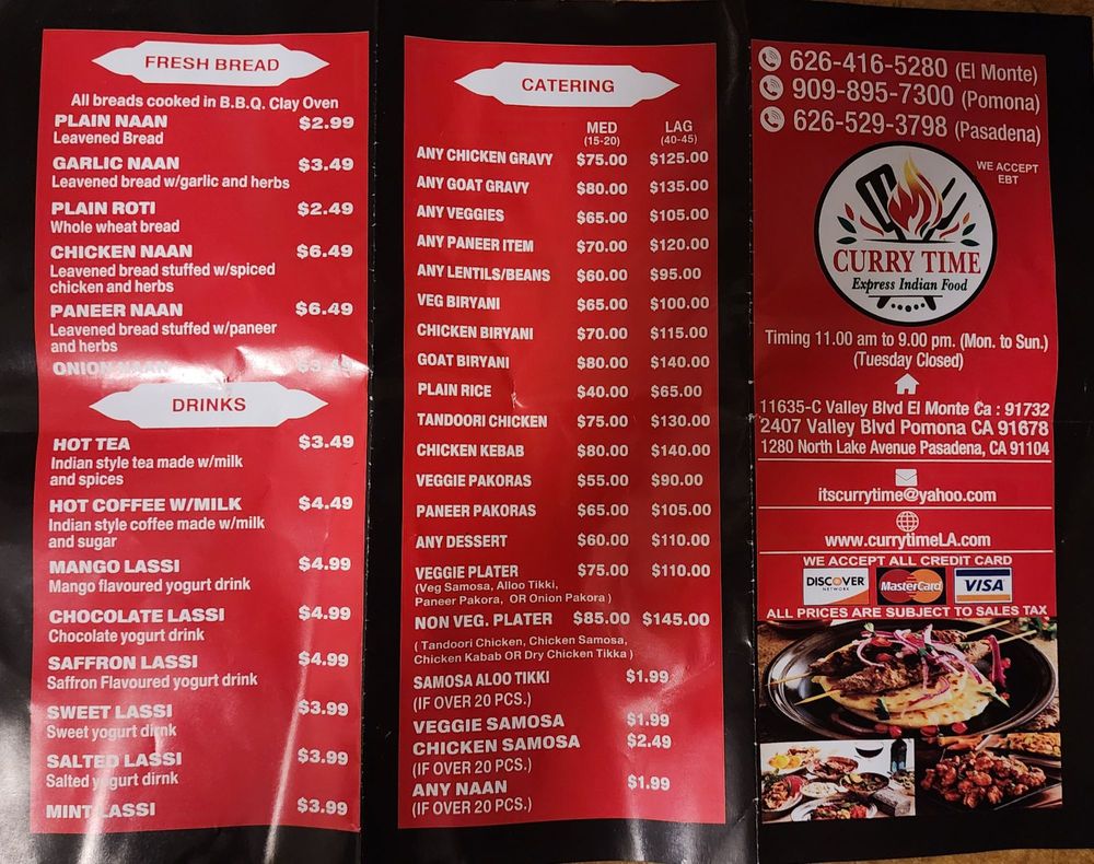 Introducing Curry Time, an Indian restaurant located in El Monte, CA. With a wide range of vegan and vegetarian options, Curry Time offers a diverse menu that caters to all tastes. Customers raved about the flavorful dishes, generous portions, and top-notch service. Highlights include the Chicken Tikka Masala, Black Pepper Chicken, and the Mango Lassi drink, all bursting with fresh and bold flavors. The traditional atmosphere and attentive staff create a welcoming dining experience. Whether you're looking for a quick takeout meal or a leisurely dinner with friends, Curry Time has something for everyone. Don't miss out on their new items like the Afghani Chicken or their popular pizza. Make sure to stop by and savor the best curry in town at Curry Time!